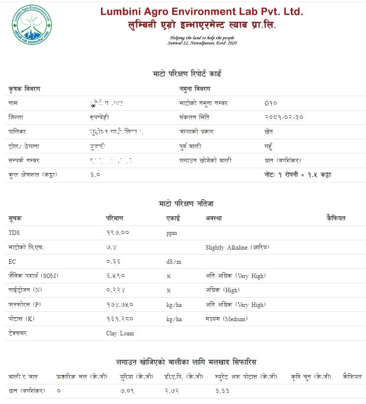 नवलपरासी, सुनवल -१२ भुमहीमा अवस्थित लुम्बिनी एग्रो इन्भायरोमेन्ट ल्याब प्रा लिले माटो परिक्षण गरी उपयुक्त मल-खाद सिफारिश गर्ने सफ्टवेयर विकास गरे संगै लुम्बिनी प्रदेशका लाखौँ किसान लाभान्वित हुने देखिएको छ l सन् २०२१ बाट संचालनमा सफ्टवेयर परिक्षणकाल सकेर पूर्णता पाएको हो l माटोको परिक्षण बाट प्राप्त नतिजा लाई लगाउन खोजिएको बालीको आवश्यकता अनुरुप भूगोल सुहाउँदो मल-खाद सिफारिश गर्न थालिएको हो l यसरी गरिएको सिफारिश अनुरुप मल-खाद प्रयोग गर्दा १ बिघा जमिनमा ६०००० रुपैया सम्म अधिक आमदानी हुने देखिन्छ l पहिलो चरणमा प्रयोगशालाले मात्र प्रयोग गर्ने र निकट भविष्यमा माटो परिक्षणको नतिजा अनुरुप कृषकले समेत उपयुक्त मल-खादको सिफारिश लिन सक्ने छन् l